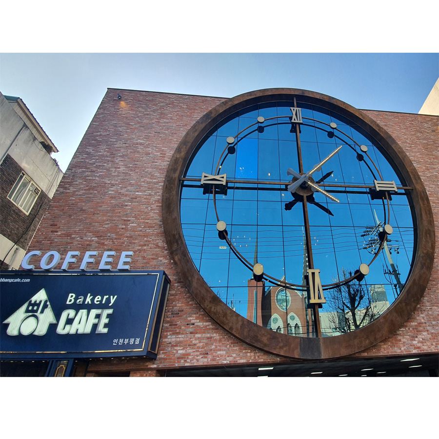인천 빵카페의 랜드마크이기도 한 큰시계입니다. 처음 봤을 때 조각품인 줄 알았는데 진짜 시계였다. 2층 창가 테이블에 앉아 창밖을 바라보면 시계바늘이 조금씩 움직이는 게 보인다.